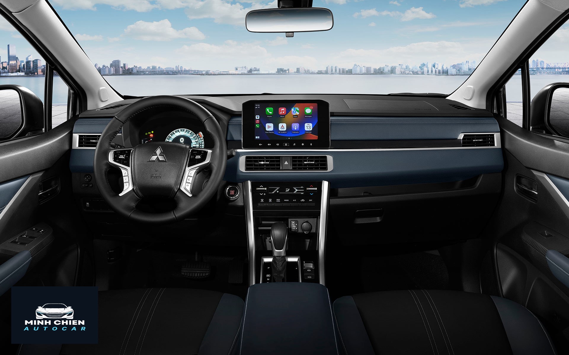 Khoang lái Mitsubishi Xpander Cross 2025 nâng cấp kiểu thiết kế theo phương ngang đem lại nét hiện đại và sang trọng. Ngoài ra, những chi tiết trên xe từ ghế ngồi, bảng táp lô và tapi được phối 2 tông màu Xanh Navy – Đen nhấn mạnh phong cách thể thao.